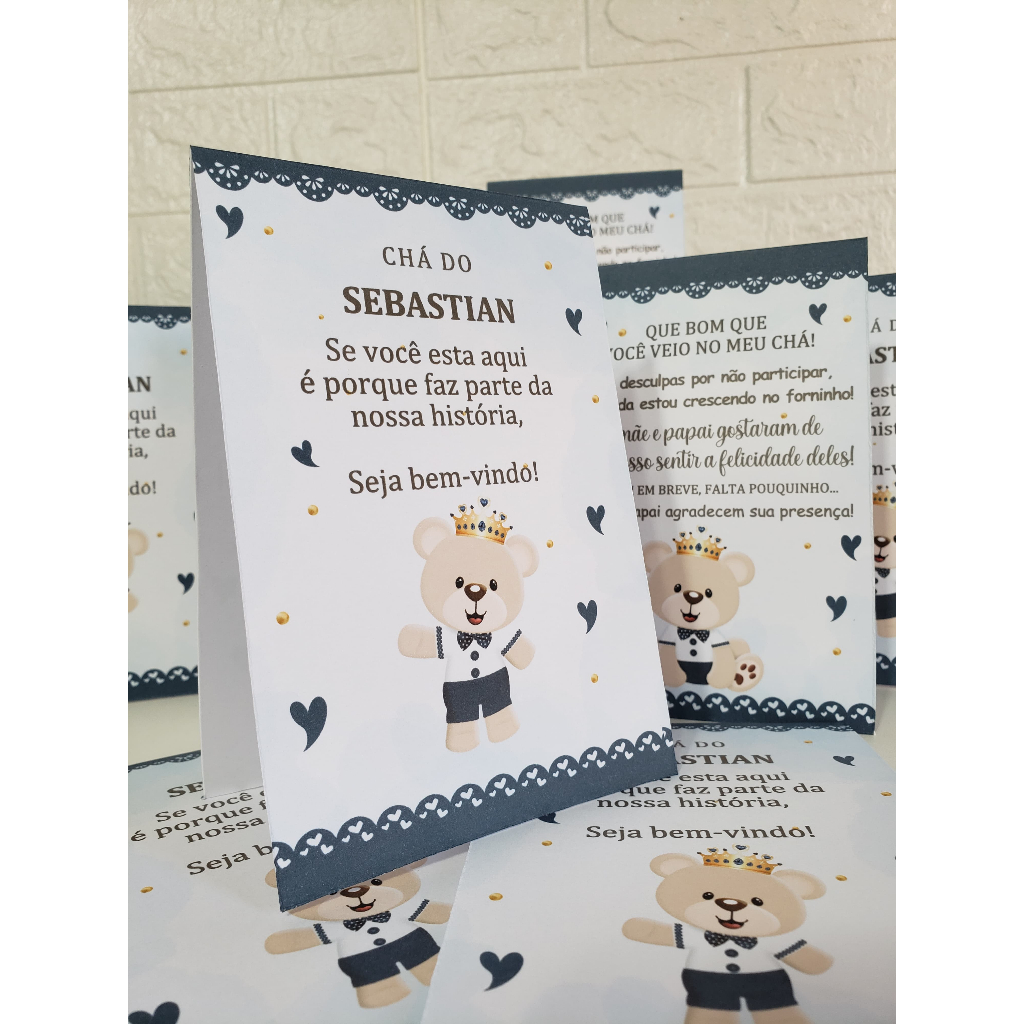 Kit Centro de mesa agradecimento personalizado chá de bebê chá fraldas tema ursinho príncipe azul marinho azul escuro