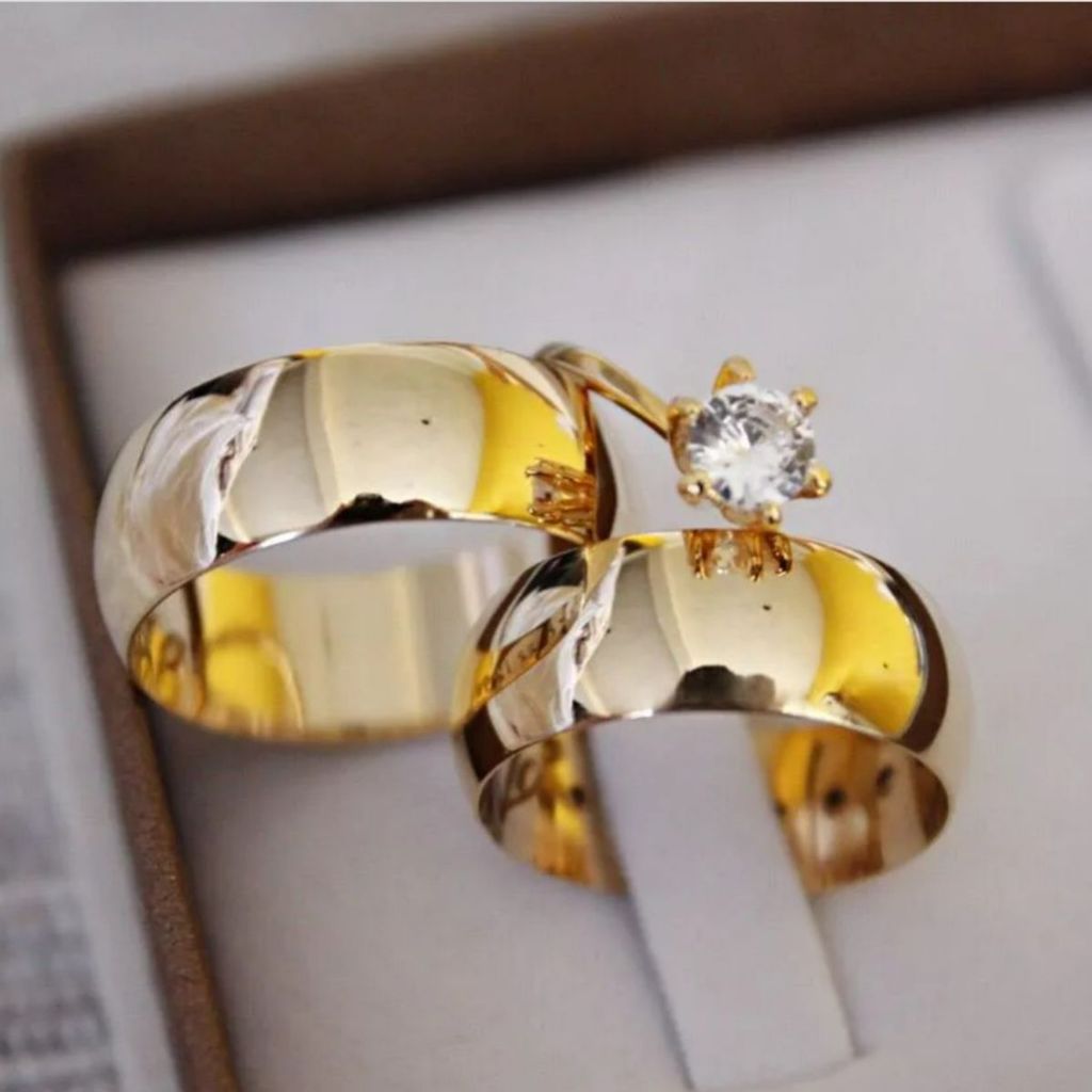 Aliança de Casamento 4mm + Solitário Zircônia Par de Alianças Noivado Chanfrada Fina Banhada Aço Inoxidável Cor Ouro 18k A_04