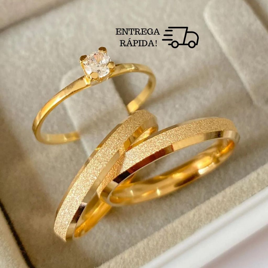 Par de Aliança 2mm fina de Casamento Ouro 18k + Anel Solitário | Aço Inoxidável com banho de Ouro 18k Modelo premium 2mm Alianças finas Clássicas delicadas | Noivado | Compromisso sem Caixinha Moeda Antiga