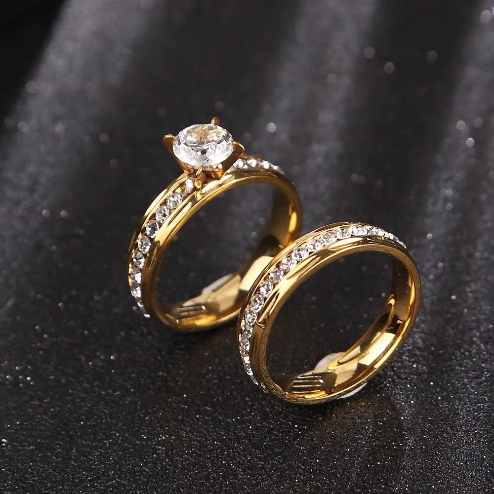 Promoção Par de Alianças de casamento de ouro Anel de noivado de aço inoxidável para mulheres com caixinha