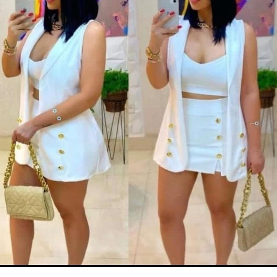 Conjunto Feminino Social Blazer manga longa ou colete + short saia + Cropped de alcinha Kit 3 peças na malha crepe.