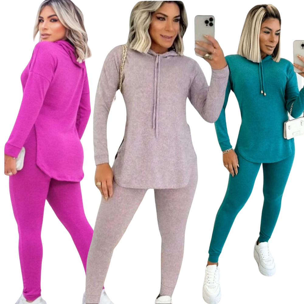 Conjunto Capuz Touca Feminino de Frio Inverno Tecido Lanzinha 2 Peças Calça e Blusa Manga Longa