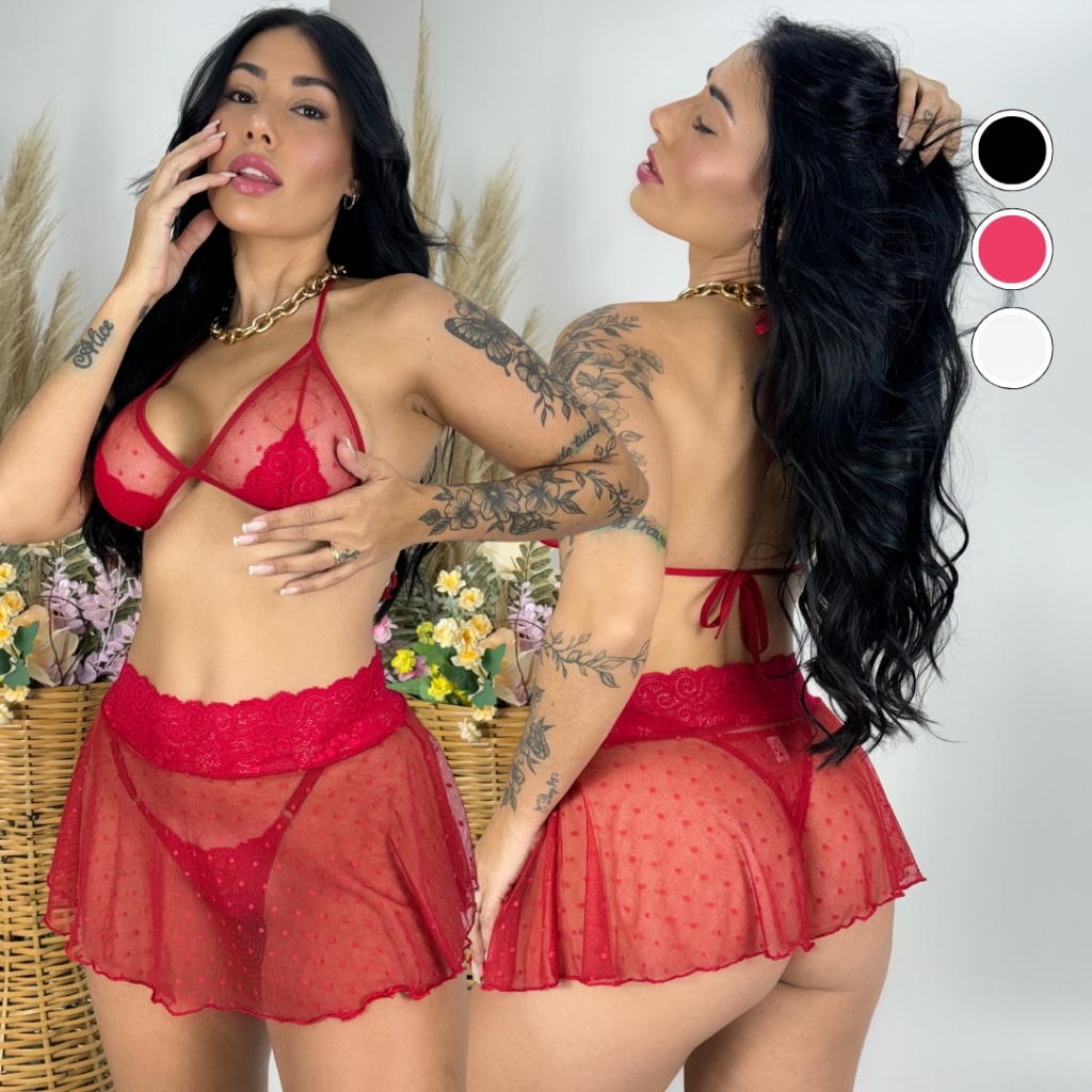 Conjunto Lingerie Tule Sexy Saia Feminino Sensual Calcinha e Sutiã Fio Dental Luxo