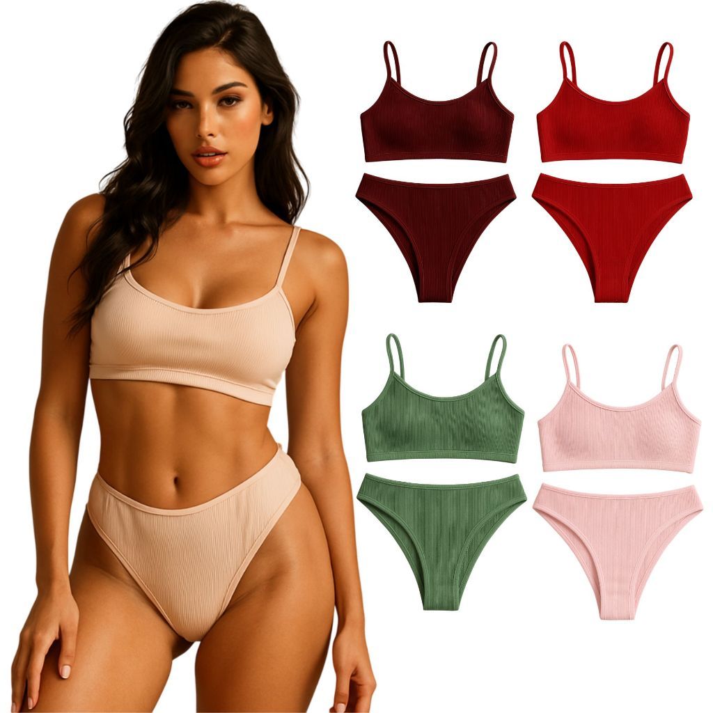 Conjunto Calcinha E Sutiã Canelado Feminino Lingerie Fio Dental Top Sem Bojo Fitness Confortável
