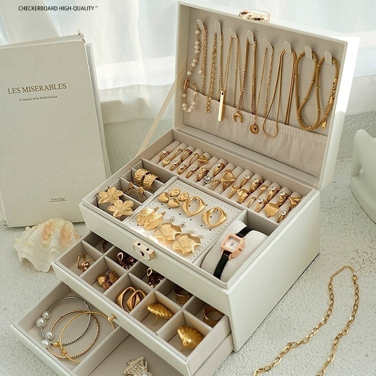 Caixa Organizadora De Jóias Feminina Em Couro Com Duas Camadas/Anéis/Colar Fecho QUEBOM