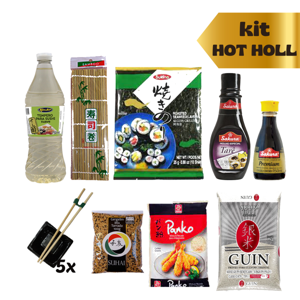 Kit Oriental para Sushi Completo para Hot Holl Arroz Oriental Alga Nori 10folhas Frasco Shoyu 150ml Molho Tarê Farinha Panko 200g