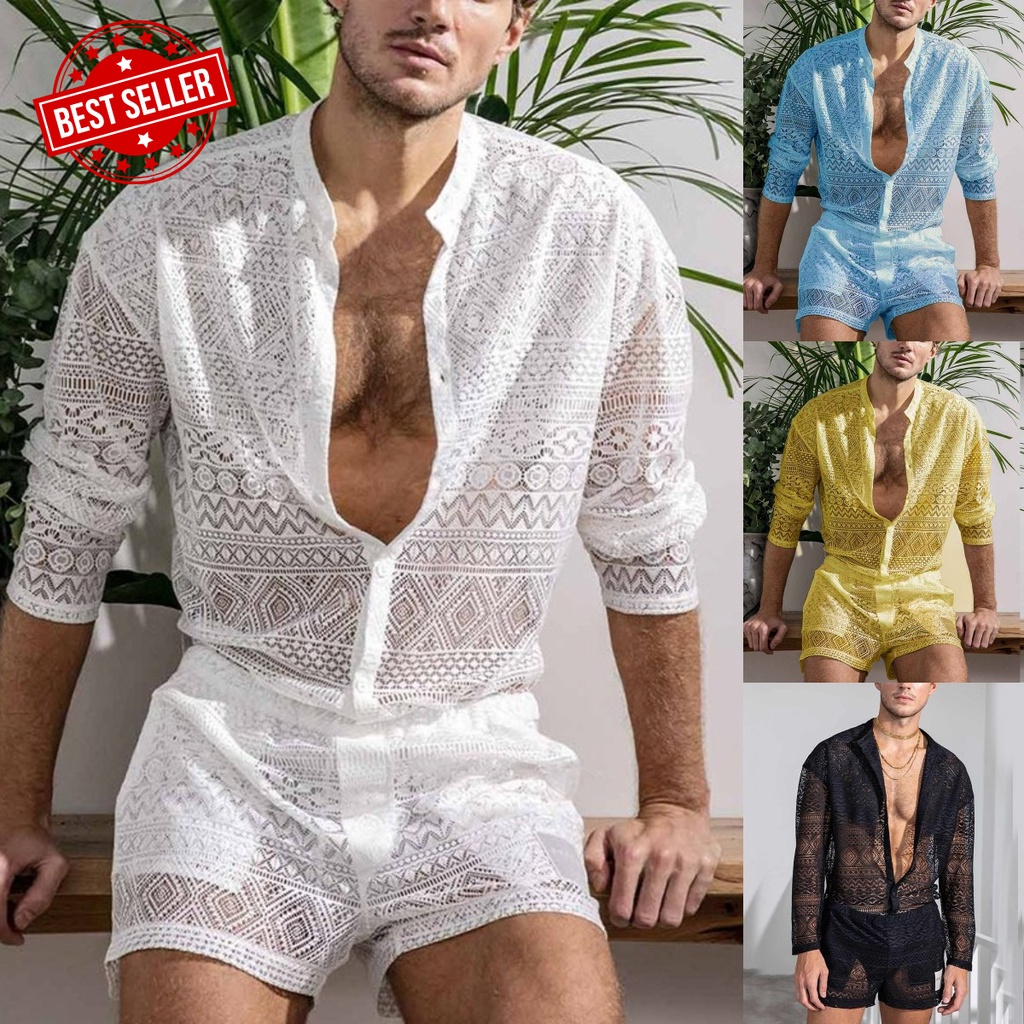 Conjunto De Renda Masculina Verão Manga Longa Camisa E Shorts Sexy Transparente Roupas Casual Praia