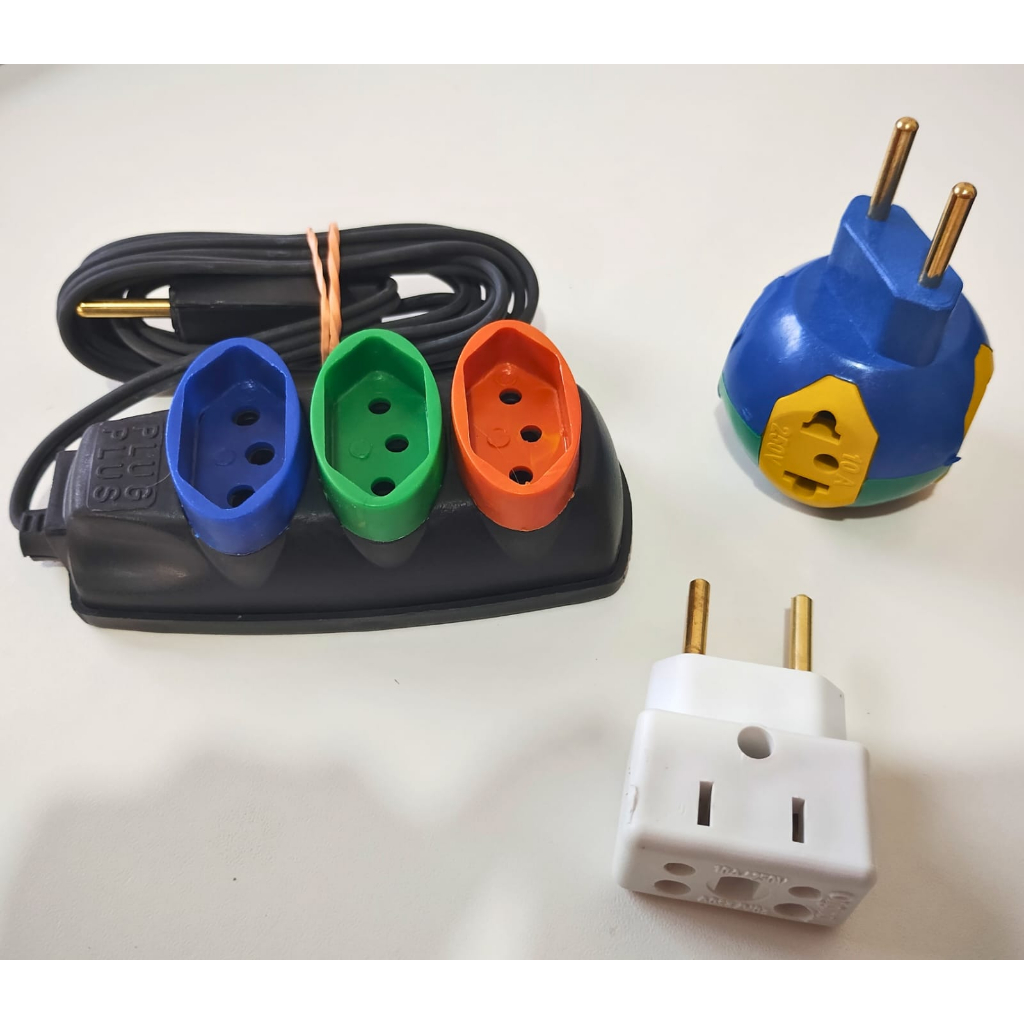 kit 3 peças Extensão Elétrica 2/3/5/10M Reforçada com 3 tomadas + T Bola Alta Qualidade e Resistencia + Adaptador Bob Benjamin tomada