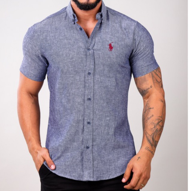Camisa Linho Slim Fit Bordado P olo Frente Manga curta social Botão na Gola