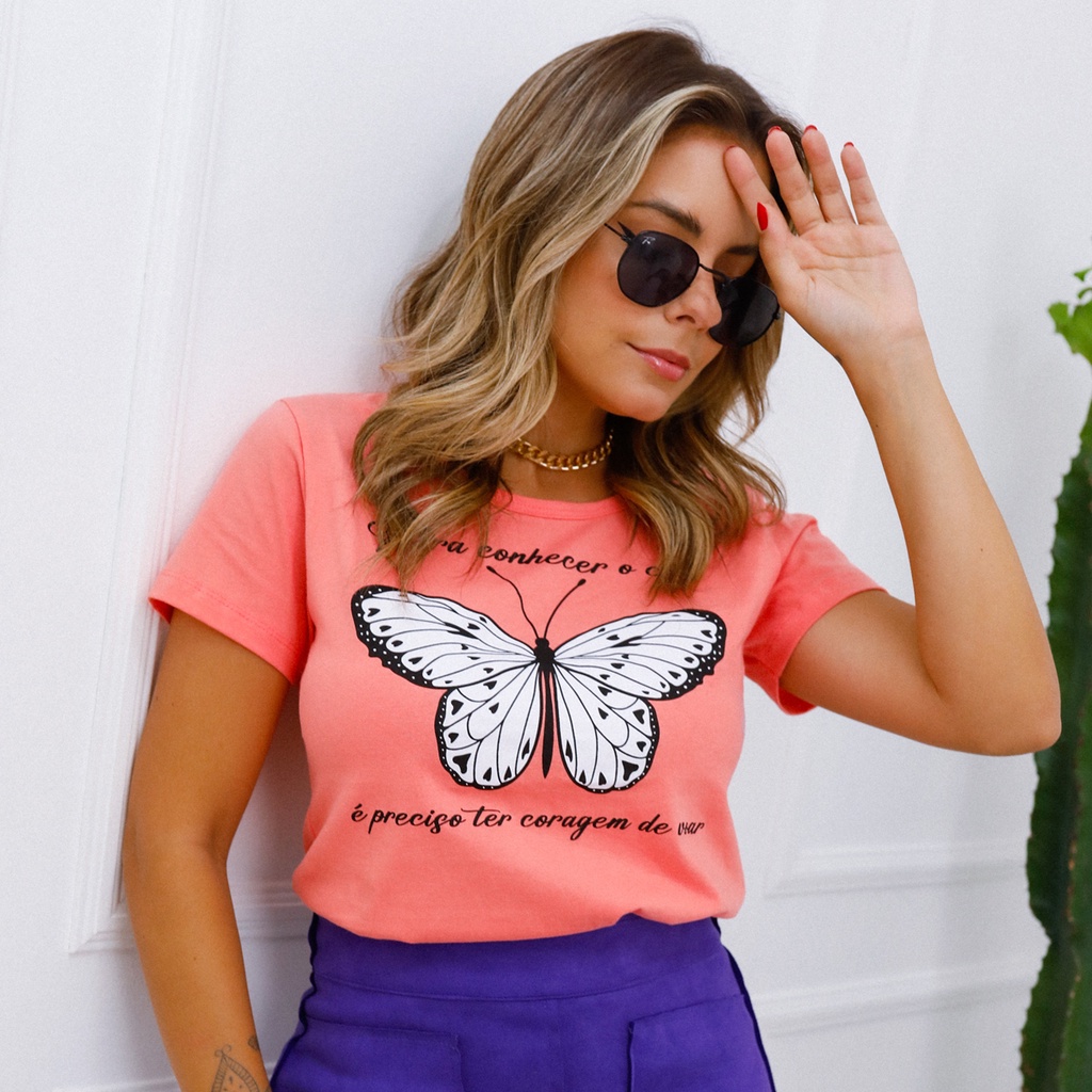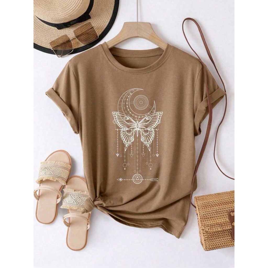 Camisa feminina de manga curta Camiseta lua e estampas de borboletas gola redonda 100% algodão