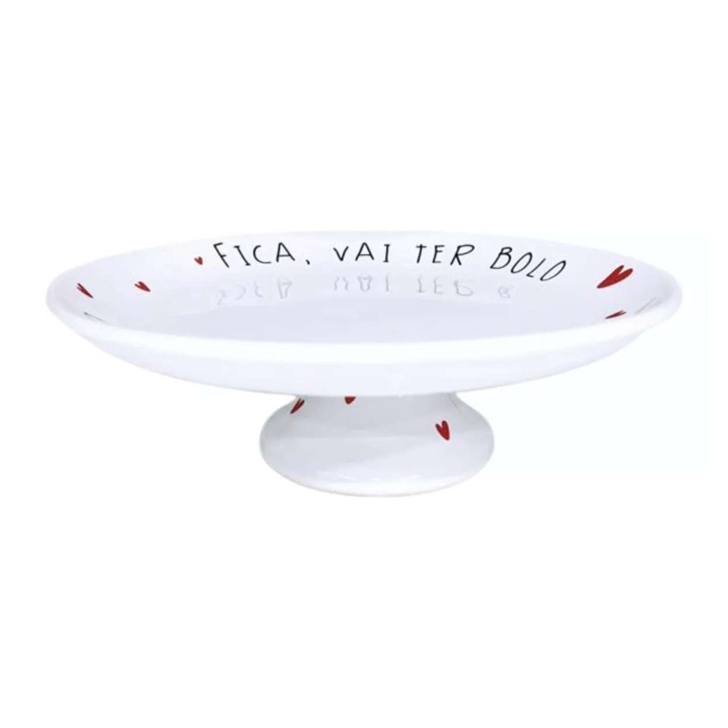 Boleira Prato de Bolo Com Pé “Fica Vai ter Bolo” Cerâmica Grande 29cm