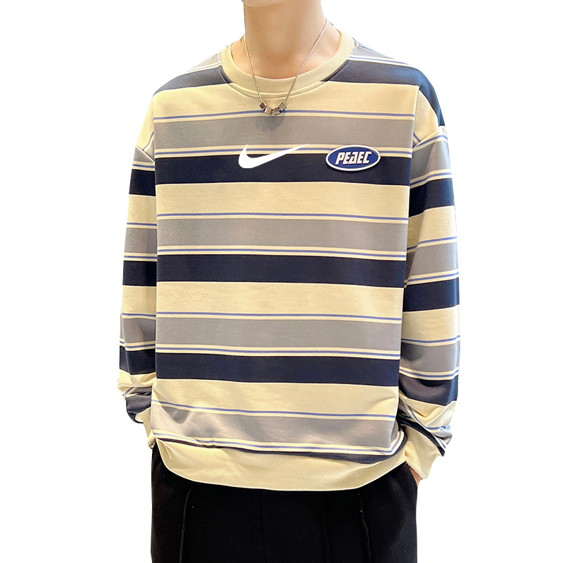 [Entrega Rápida De Qualidade Genuína] Venda A Quente Casual Solto De Listras Homens Mulheres Camisa De Pescoço Redondo De Primavera Outono Casal Nós
