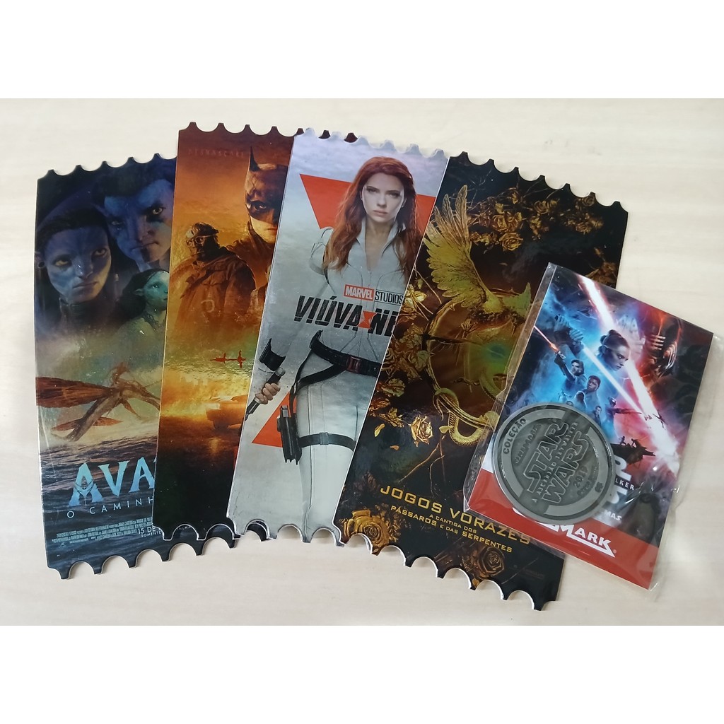 Kit 4 cards Ingressos Colecionáveis Cinemark Viúva Jogo Vorazes Batman Avatar + Medalha Star Wars