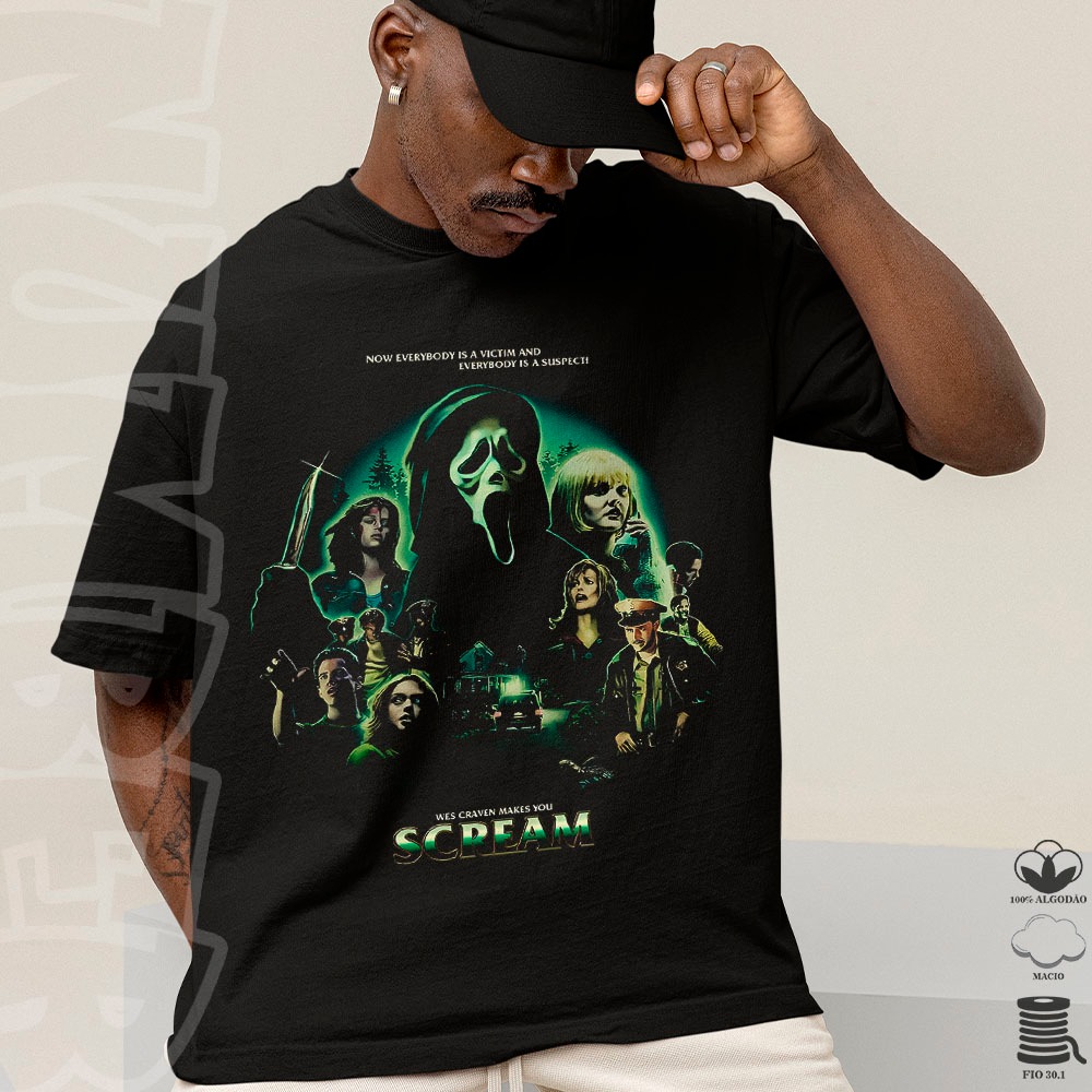 Camisa Camiseta basica e oversized estilosa filme de terror scream panico halloween movies masculina feminina em algodao