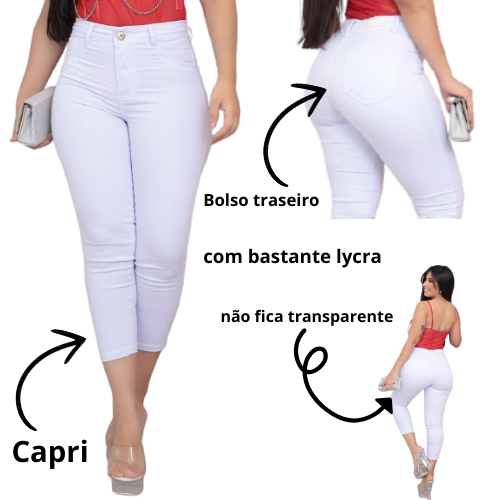 Calça Capri curta branca feminina jeans com lycra elastano cintura alta moda tendência lançamento