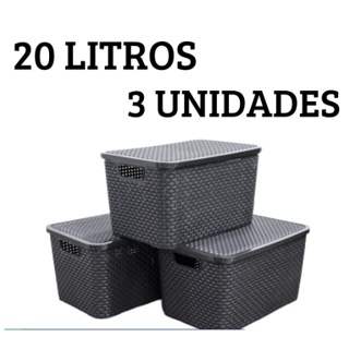 Kit 3 Caixas Organizadoras Cesto Multiuso Rattan 20 Litros Com Tampa Preto Caixa Organizadora TOY