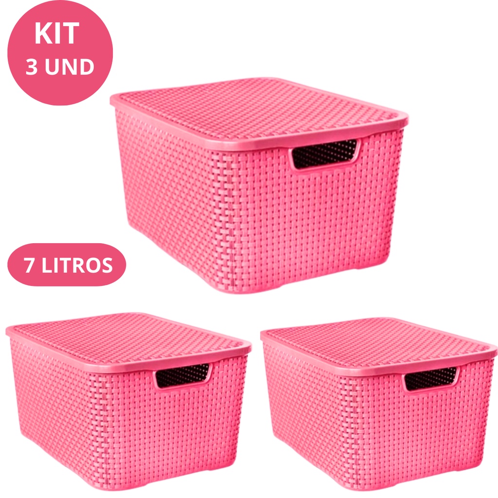 Kit com 3 Caixas Cesto Organizadora com Tampa Empilhável Plástico - 7 Litros