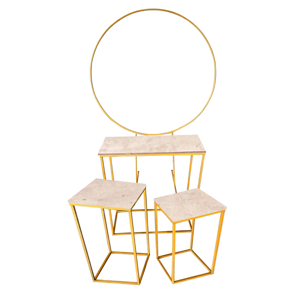 Conjunto com 3 Mesas para Decoração de Festa Aniversário e 1 Painel Rendondo Arco de Bexigas Balões e Sublimado
