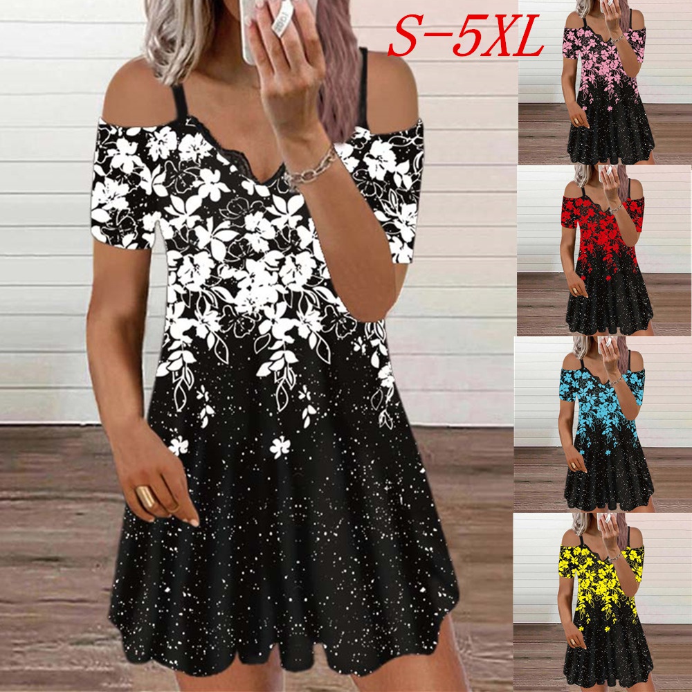 Mulher Oferta Ombro Manga Curta Renda Com Pescoço Em V Floral Impresso Plus Tamanho Vestido Solto S-5XL