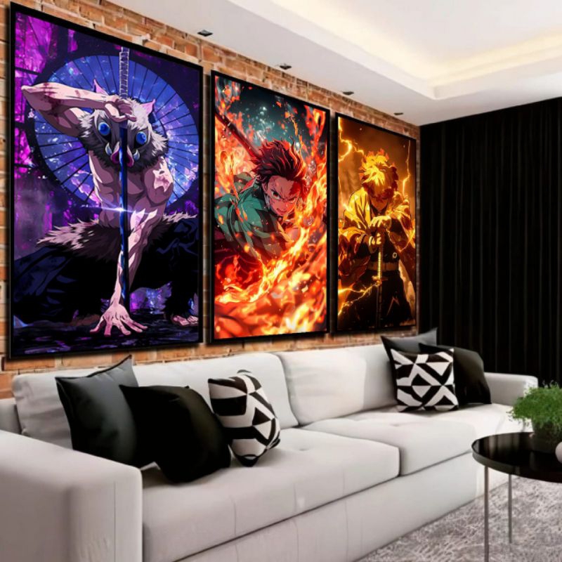 KIT QUADRO DECORATIVO ARTE GEEK ANIME MANGA DEMON SLAYER 3 PEÇAS DECORAR SALA QUARTO ESCRITORIO