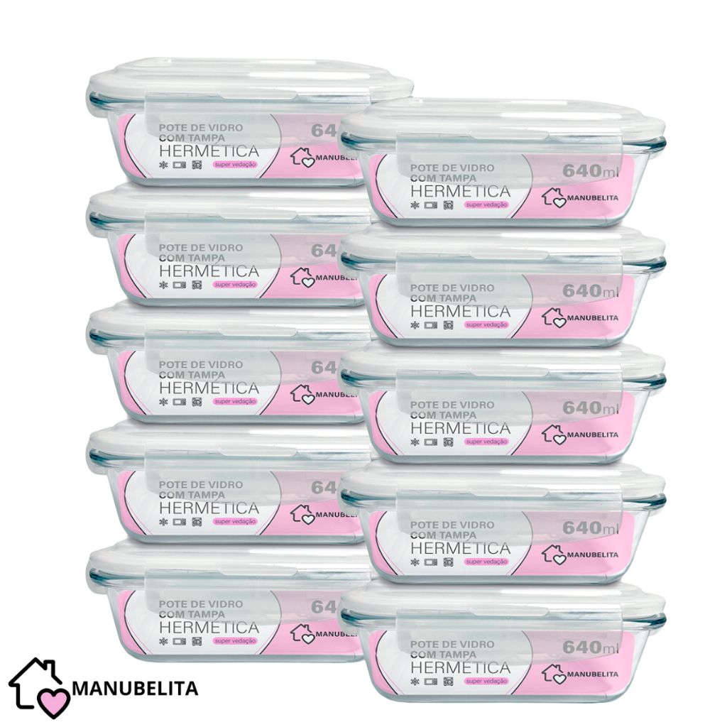 Conjunto 10 Potes 640ml Marmita Vidro Hermético Travas Forno Com Quatro Travas Retangular Fitness