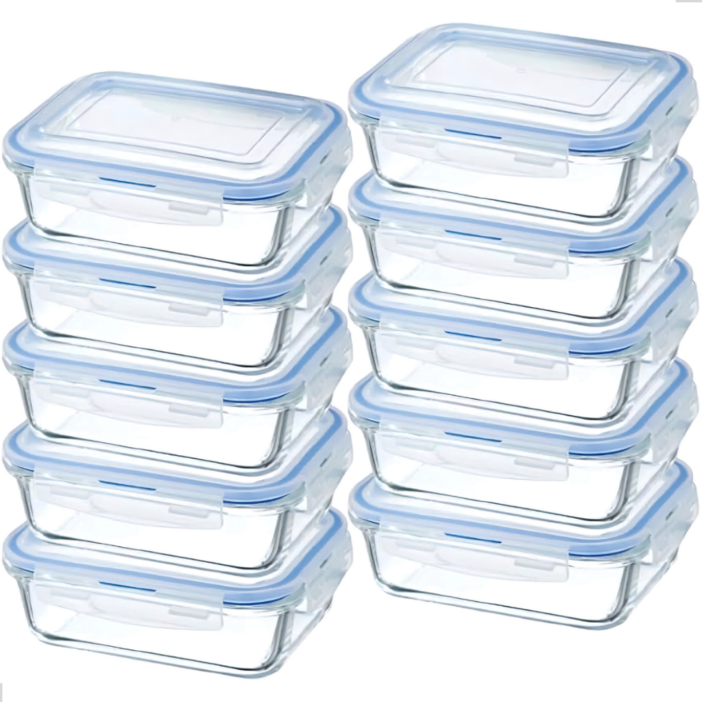 Conjunto de 10 Potes de Vidro Borossilicato Capacidade de 640 ML Com 4 Travas Hermética Vedação em Silicone Vai ao Freezer Micro-ondas e Forno Alta Resistência Produto Premium Marmita Fit Organizador de Geladeira BPA FREE