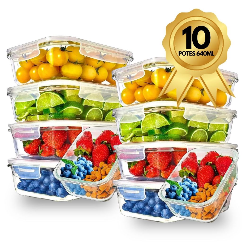 Conjunto 10 Potes de Vidro 640ml Hermético Marmita Fit com Tampa 4 Travas