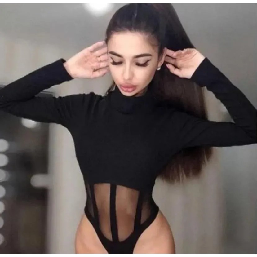 Body Feminino Bori Tule Preto Manga Longa Gola Alta Inverno Tendência Preto Branco Transparente Moda Blogueiras Lindo P ao GG
