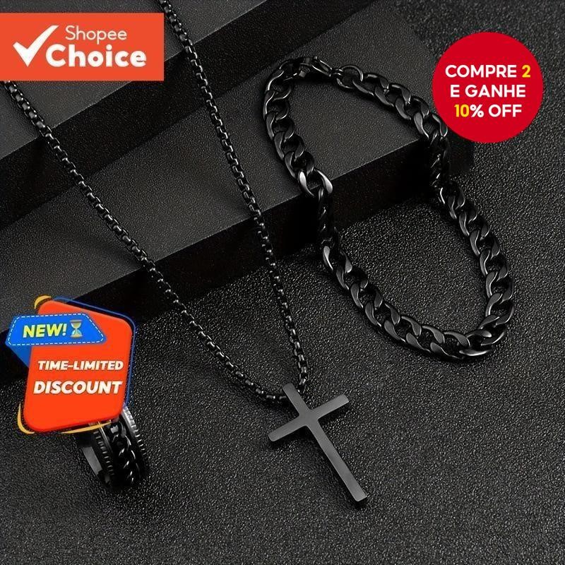 3 Pçs/Set Simples Estilo Punk Cruz Design Pingente Colar Temperamento Dominador Masculino All-match Conjunto De Jóias