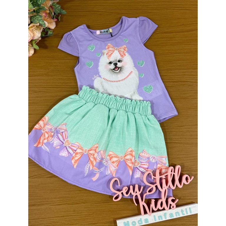 Conjunto Infantil Kukie Verão Com Saia e Blusa Cachorrinho