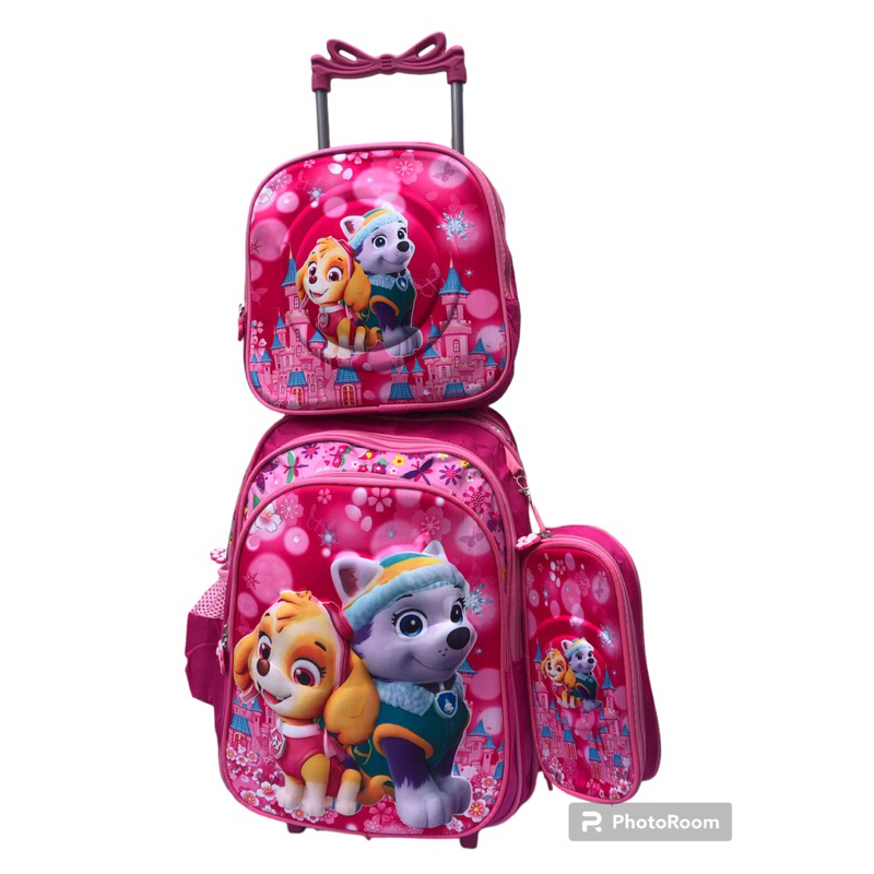 kit mochila escolar 3D patrulha canina feminina com rodinhas estojo e lancheira térmica