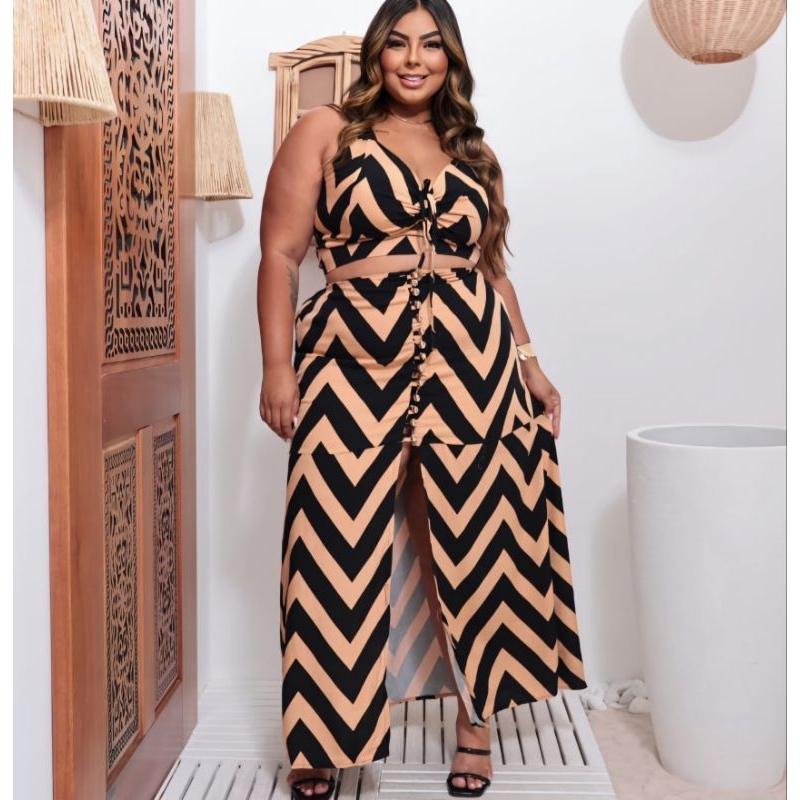 Conjunto plus size cropped e saia longa com fenda - estampa zig zag