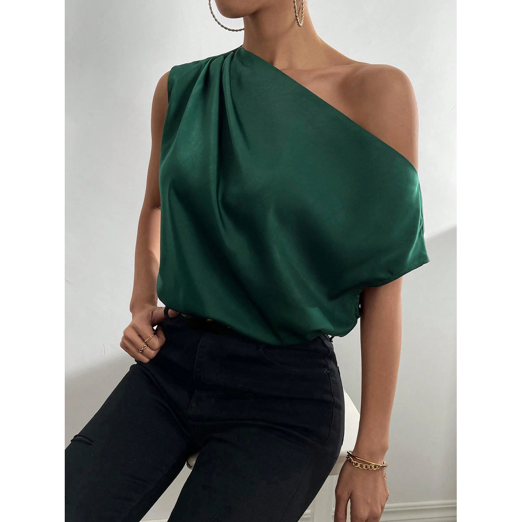 Blusa Feminina de cetim elegante de um ombro Slim Fit Estilo Sem Mangas para as noites de verão verde escuro XXL
