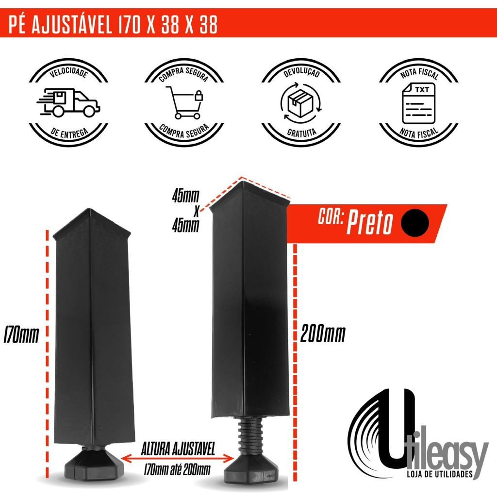 Kit 2/4/6/10/20 Pé para moveis Regulável Pés de Armário Cozinha de 17cm até 20cm Quadrado Preto
