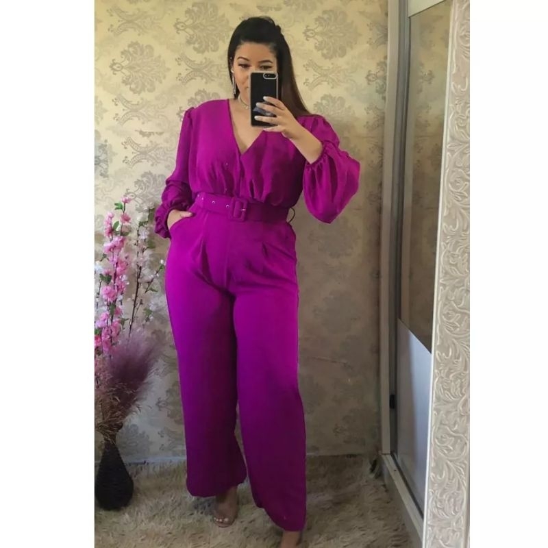 Macacão feminino plus size pantalona com manga longa com cinto e bolso