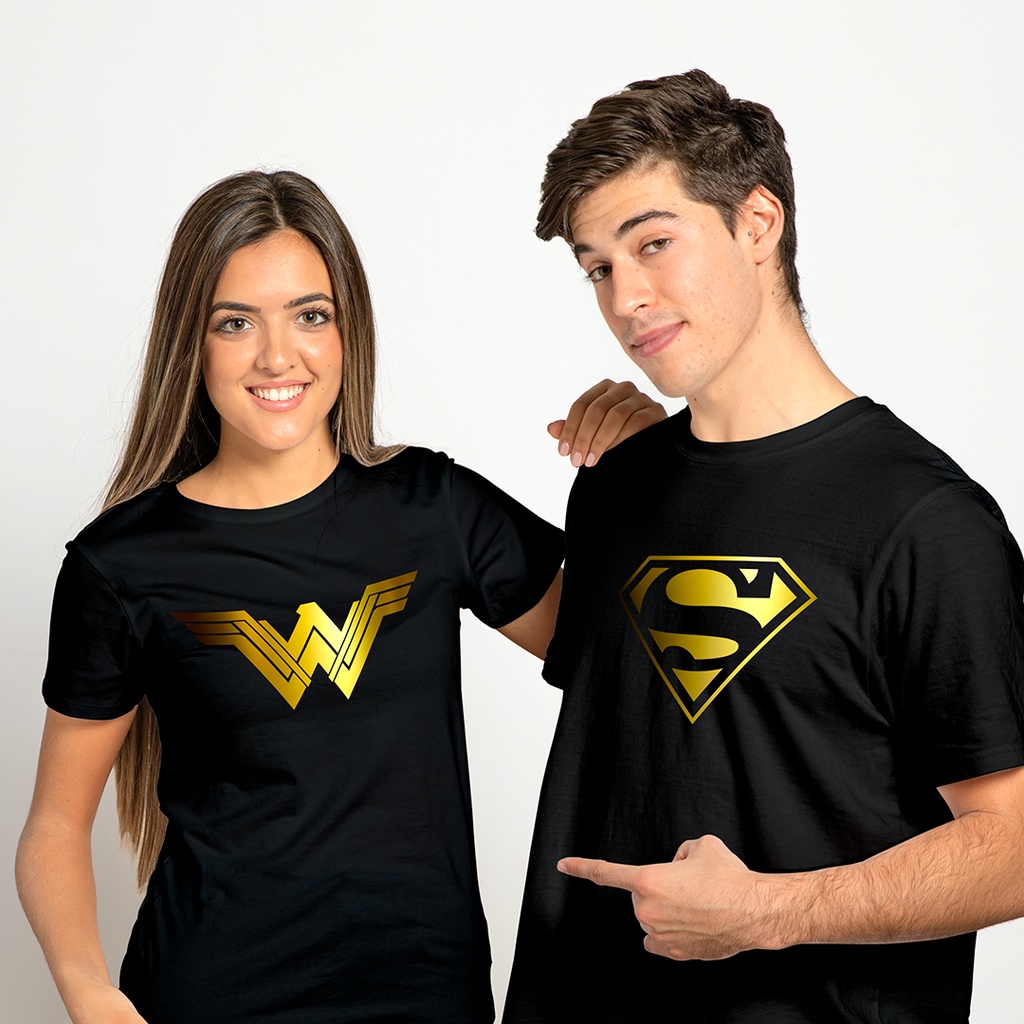 Camiseta Super-Homem e Mulher Maravilha - Dourada - Babylook e Camiseta