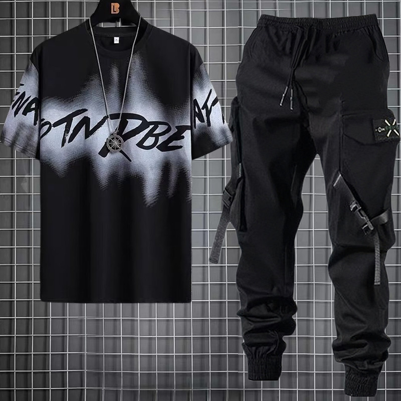 Conjunto De Camisetas De Moda Masculina Com Mangas Curtas Casuais + Calças De Carga Hip Hop Joggers