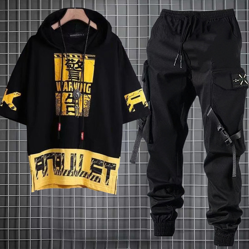 Calças De Carga Masculinas Estilo Hip Hop Joggers + Conjunto De Homens Com Capuzes Casuais Camisetas De Manga Curta Vestuário Masculino De Verão