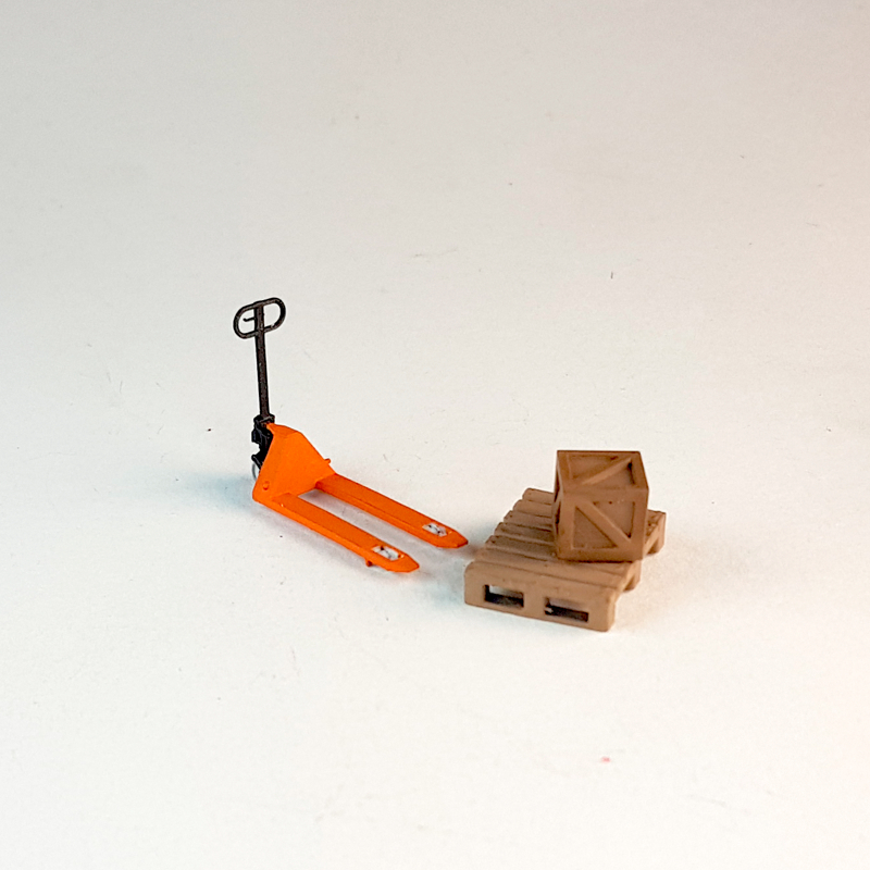 Peças para Diorama e Expositores Hot Wheels escala 1:64 - Paleteira + palet + caixa, em resina pintados a mão. Foto1
