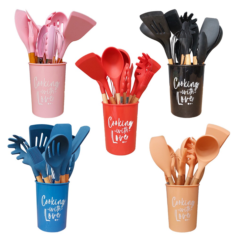 Jogo de Cozinha Kit com 5 pcs ou/ 12 Peças de Silicone, Utensílios e Copo Suporte Cabo de Madeira
