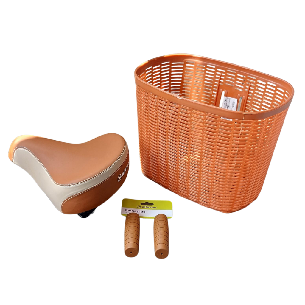 Kit Bicicleta Bike Retrô Cesta para transportar compras, pet Selim retrô com molas e par de Manoplas confortáveis Marrom Vintage