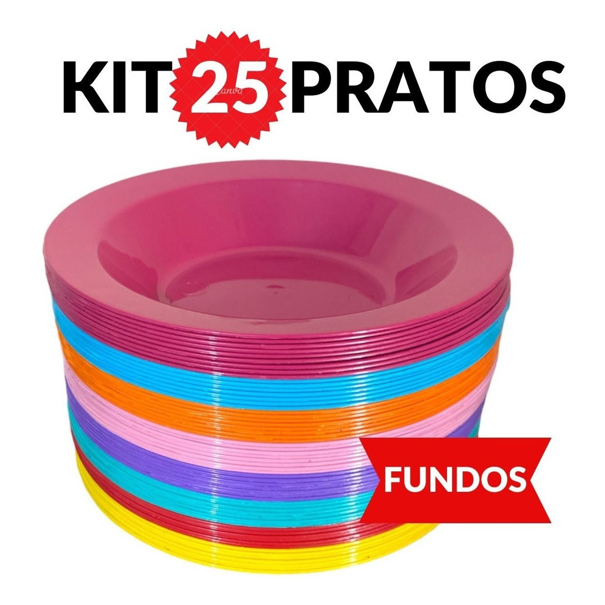 Kit 25 pratos fundo redondo de plástico colorido p/ refeição merenda escolar lanche