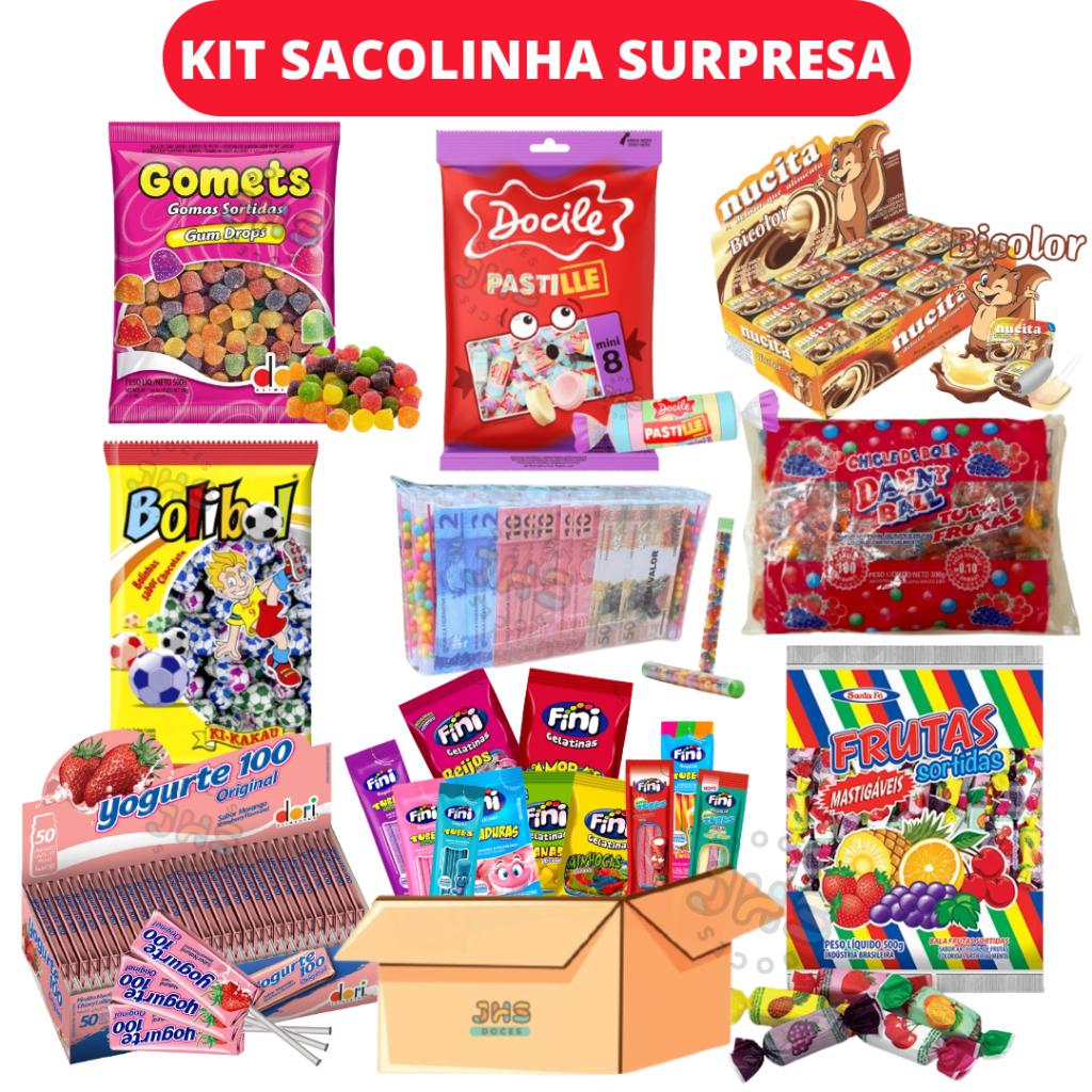Kit Sacolinha Surpresa Doces de Festa infantil Para Aniversario 223 Itens Fini Pipoca Balas Chicletes Bombom Pirulito