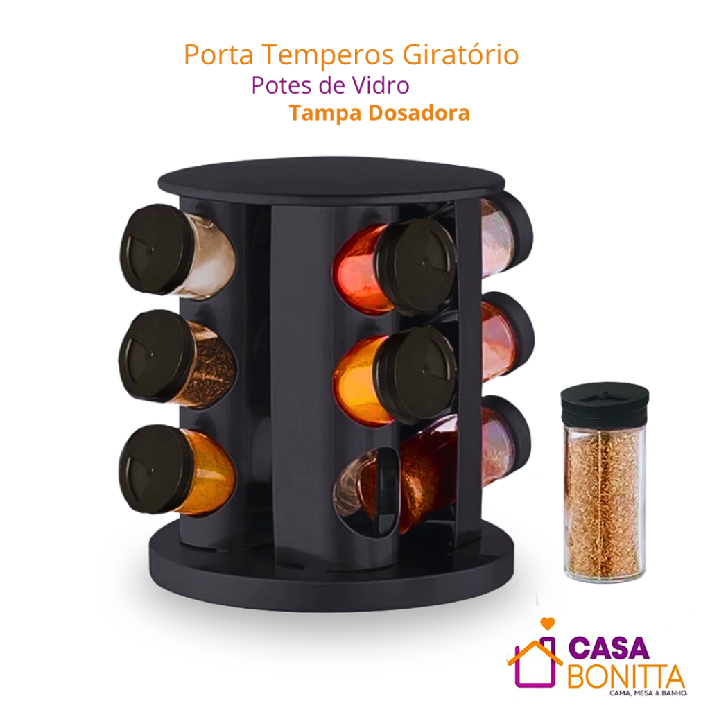 Porta Temperos Condimentos Giratório 6, 9, 12 Potes Vidro 90G com Tampa Dosadora Preto Cozinha
