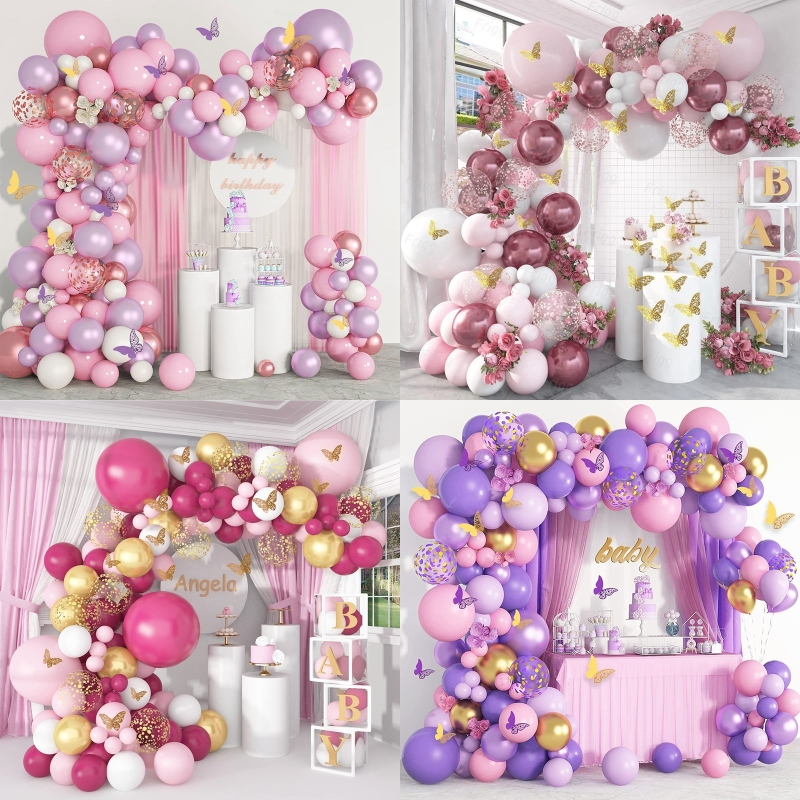 Kit 179 Arco Desconstruído Balão Borboleta Bexiga Rosa P/ Chá de Bebe Menina Rose Ouro Confetti Balão Bexiga Liso/Cromado Para Festas e Aniversários Decoração Casamento Aniversário Decoração de Festa
