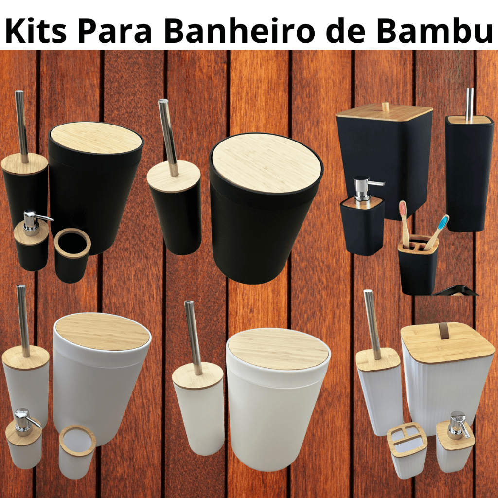 Kit para Banheiro de Bambu e Plástico Moderno e Decorada Porta Sabonete Escova de Vaso Lixeira Conjunto Preto ou Branco