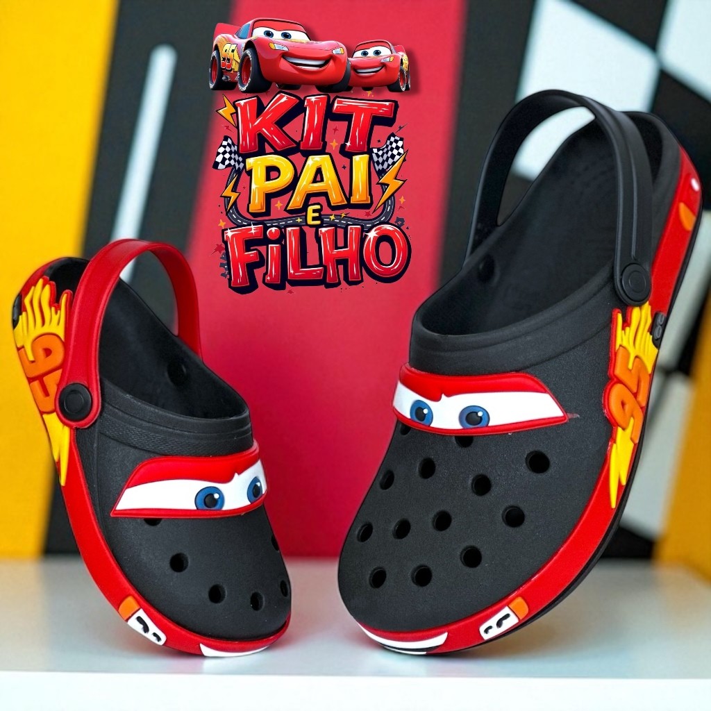 KIT MACQUEEEN PAI E FILHO SANDALIA BABUCHE ADULTO INFANTIL PARA MENINO