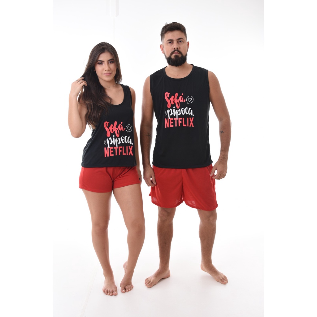 Kit 2 Pijamas Netflix Adulto verão Masculino e Feminino Casal Preto e Vermelho