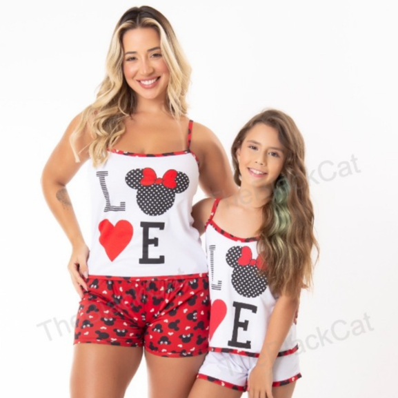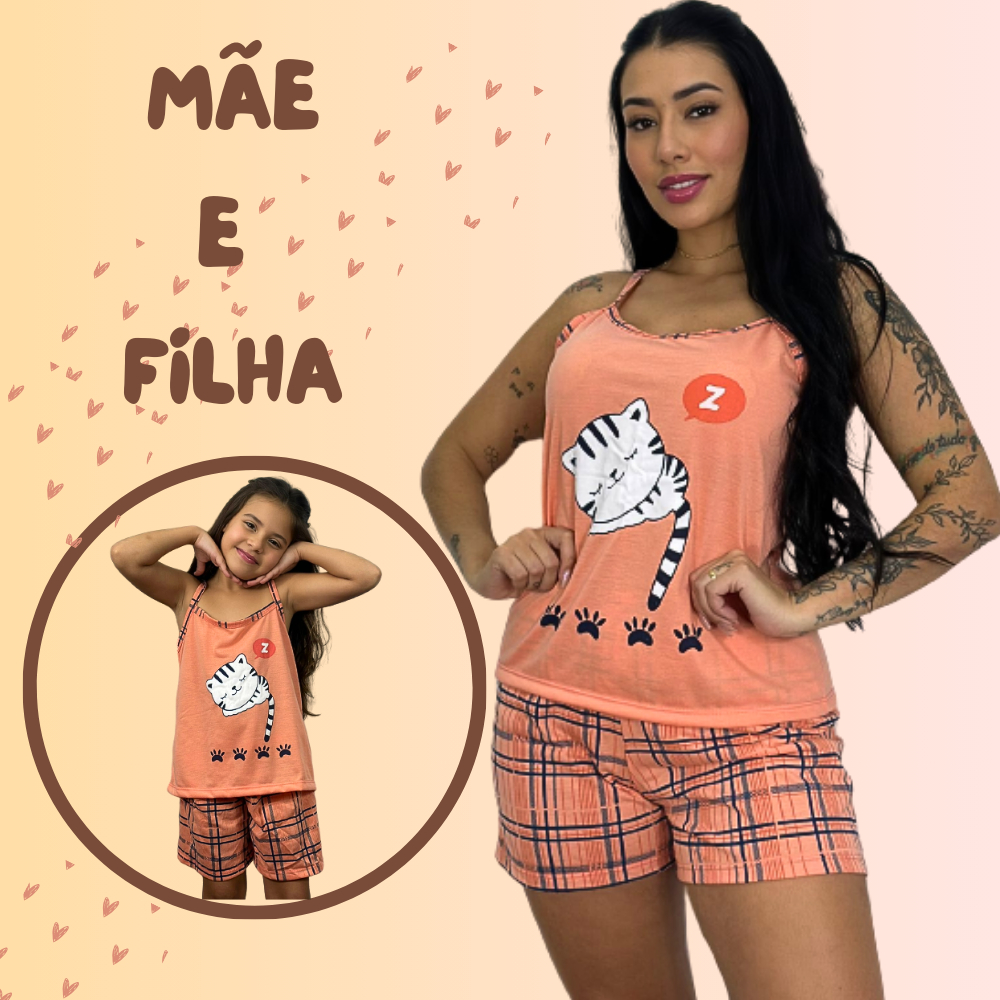 KIT 2 Baby Doll Mãe e Filha Gatinho Malha Confort Pijama Short Doll Verão