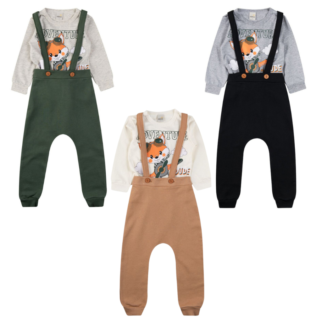 Conjunto Calça Suspensório e Blusa Manga Longa Bebê Menino | Conjunto Inverno Bebê Menino